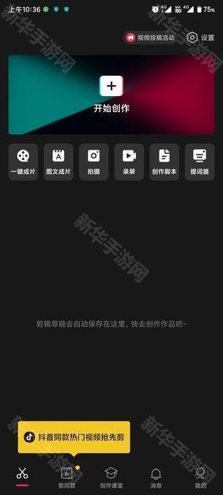 1、想要添加转场效果时打开剪映首页,然后点击“开始创作”;