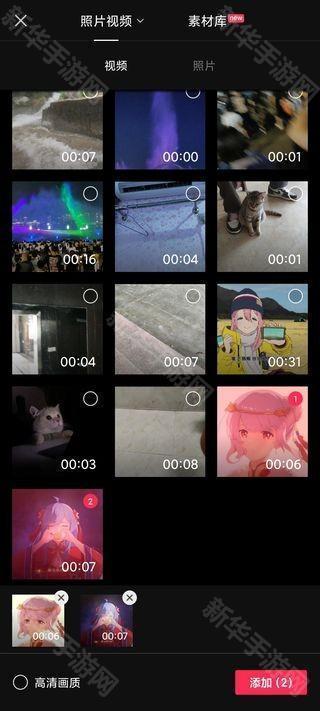 2、打开照片视频界面或者素材库,勾选至少两段视频作品,然后点击“添加”;
