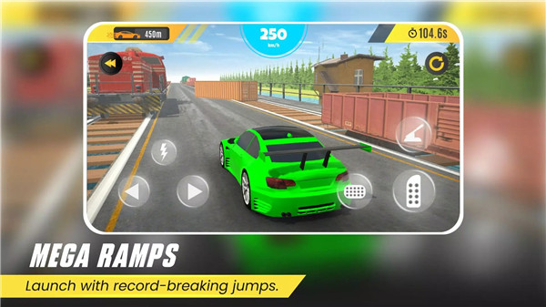 【极限坡道X速度跳跃】这是一款赛车竞速类型的游戏,游戏由“Hashe Computer Solutions”工作室出品,以更快的速度、更快的最高速度和独特的外观解锁赛车。火车、河流和集装箱等障碍物可能会给你的汽车带来挑战性的困难。在赛道上,玩家需要通过向左或向右倾斜设备或点击屏幕两侧的箭头来控制赛车的方向,让车辆做出漂移的动作,体验非常的好,快来试试看吧。