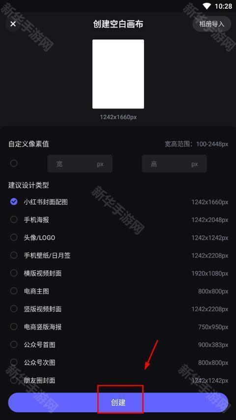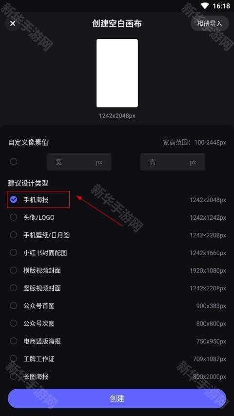2、点击手机海报,然后创建,并支持自定义像素值;