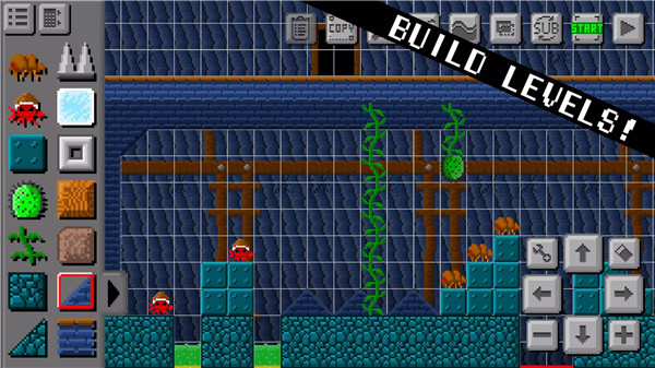 玩家可以自创属于自己的关卡,玩法类似马里奥制造,但是可以自由的设定背景的环境和树木小细节等等,甚至可以调整方块的大小,让你能够轻松的体验整个游戏流程。