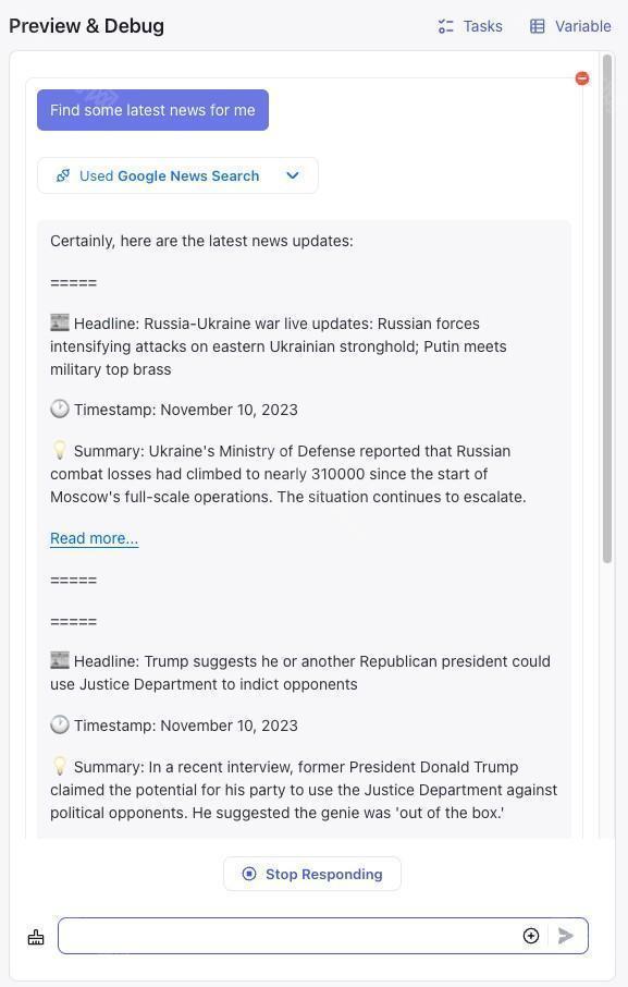 可以将包含不同工具的插件添加到机器人中以扩展其功能。对于新闻获取机器人,我们可以使用“Google News Search”插件下的“searchNews”工具。此工具可以根据您的要求获取 Google 新闻。