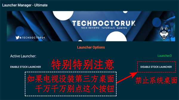 如果你的电视或机顶盒没有安装第三方桌面app,那千万别点击右下角那个“DISABLE STOCK LAUNCHER”按钮,否则开不了机而可能变砖,后果自负。