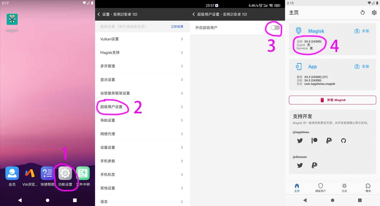 2、功能设置 – 超级用户设置(开启)- Magisk支持(开启)- Vulkan设置(开启)