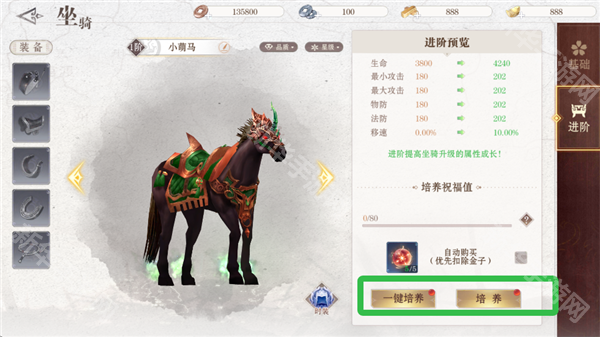 坐骑进阶可大幅提升坐骑属性和升级成长值。