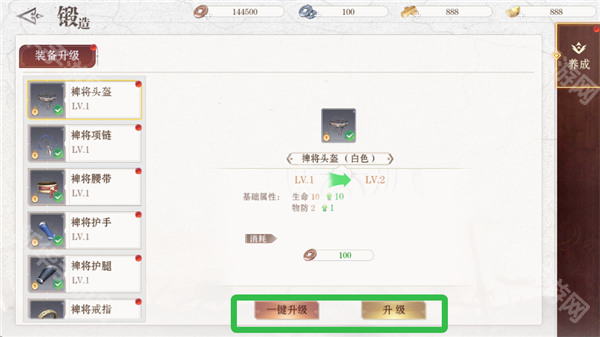 升级装备可提升其基础属性,不同的装备属性各不同。