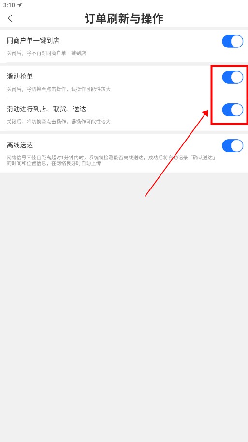 可以将“滑动抢单”与“滑动进行到店、取货、送达”两个都打开,可以更快的实现抢单。