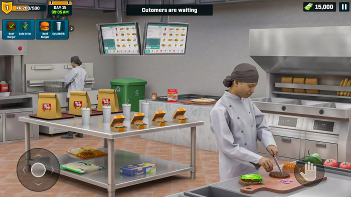 《厨师模拟快餐游戏》这是一款模拟经营类型的游戏,游戏由“Hyper Joy Games”工作室出品,这款游戏让玩家拥有一家汉堡快餐店,你可以在这个快餐店中为客人服务,端上美味的汉堡和薯条等等,一开始一切只有你一个人,而后期,玩家可以雇佣员工,让他们分工合作,包括制作汉堡和前台收银等等,确保每个顾客满意,让整个餐厅蒸蒸日上,精准高效的完成每一个订单,扩张你的快餐店。