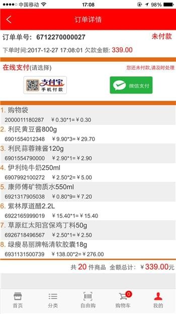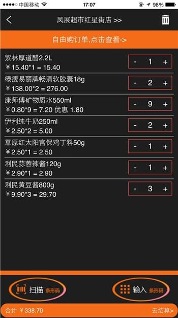 用户在超市,可以一边选货,一边用手机自助扫描商品条形码;手机自助支付成功后,不必走收银台,不用排队即可完成购物。