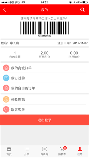 5、完成注册之后,我们就会进入到如下界面,在这里我们能够看到相应的支付条形码、会员积分、电气券、我的收藏等一系列内容。