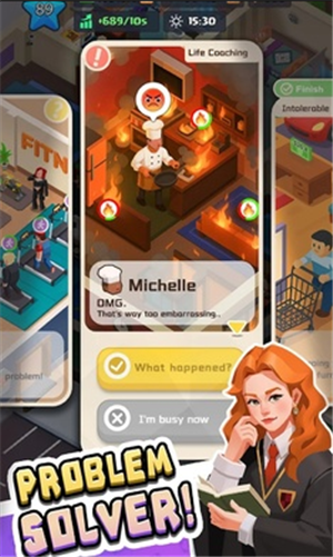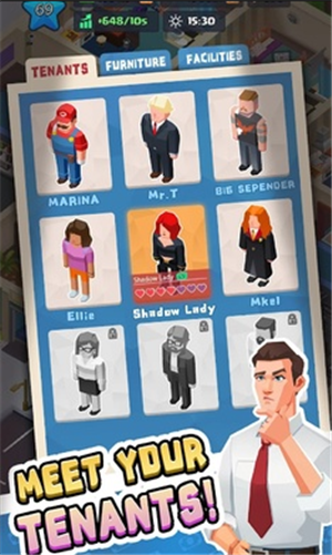游戏的玩法简单有趣,而且在经济成型之后,玩家就可以通过挂机来躺着收钱,会有很多不同的租户前往你的公寓住下,并且为他们解决问题,即可获得高评价,非常有趣。