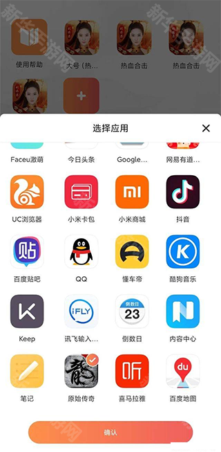 3、选择应用:点击【+】添加按钮后,会弹出你手机上已经安装的应用列表,在弹窗内需要你需要多开的应用,点击勾选后,确定选择。
