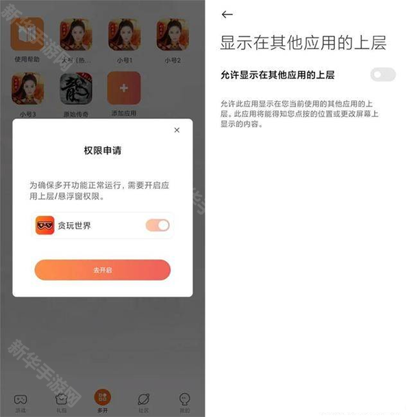 4、应用授权:勾选确定后,需要多开的游戏/应用图标就会出现在【多开】界面上,首次启动多开需要对应用进行授权,授权方式为,点击弹窗中的【去开启】,然后在应用列表上找到本软件,然后点击进入详情,把浮窗授权打开,再返回本应用内,即可完成应用授权。