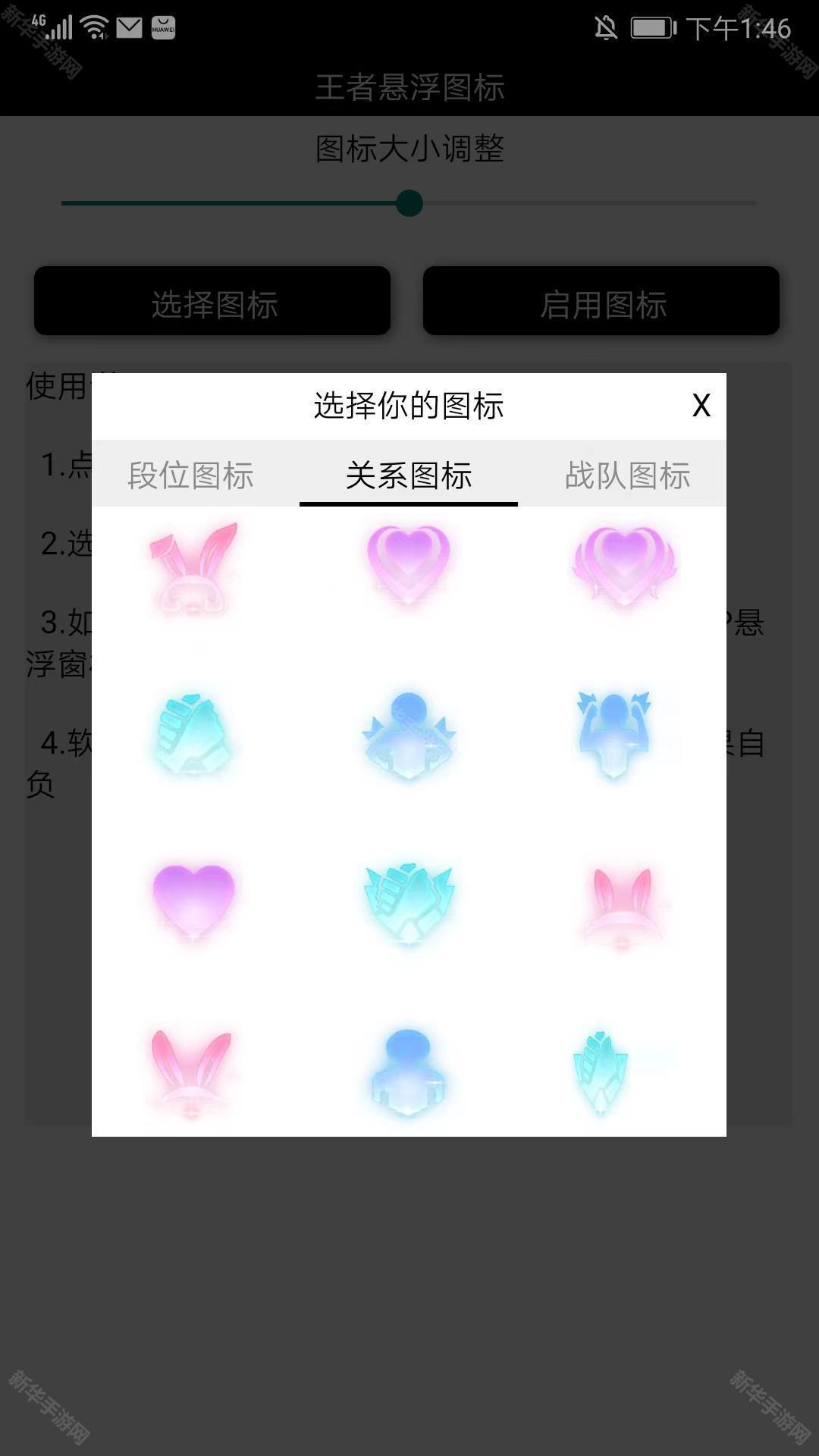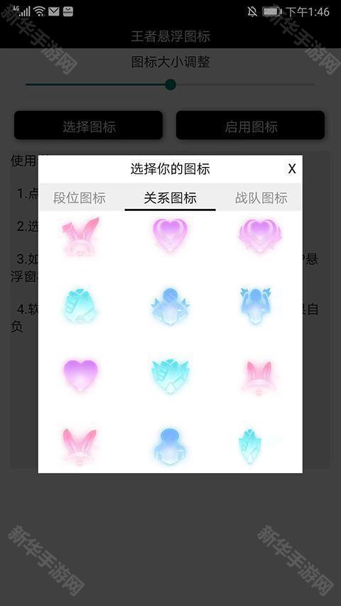 3、包括国服图标、成就图标、道具图标、段位图标、关系图标、战队图标等各种各样的图标类型和样式,用户和根据喜好选择,
