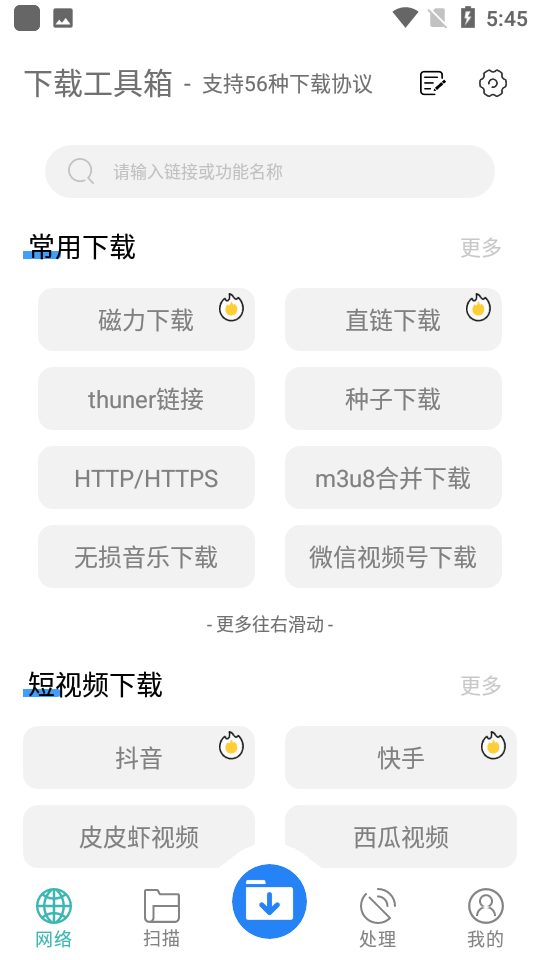 下载工具箱是一款有着很多实用的下载功能的辅助软件,软件的页面非常简洁,可以让每一位用户下载各种类型的文件,还能为用户提供高效而便捷的视频解析和去水印、种子文件、磁力链接直连下载等方式之外还能确保获得最佳的下载速度和稳定性。这款软件能够摒除一切花里胡哨内容专注下载服务,使用简洁,有需要的资源的话就用这款软件一键下载吧。