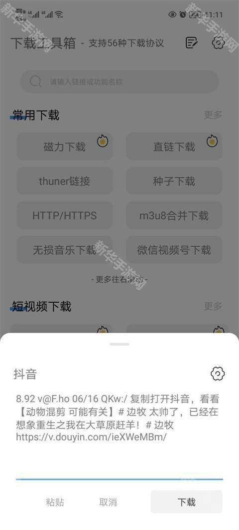 2、小编以抖音视频为例,将复制的抖音视频链接粘贴,点击下载。