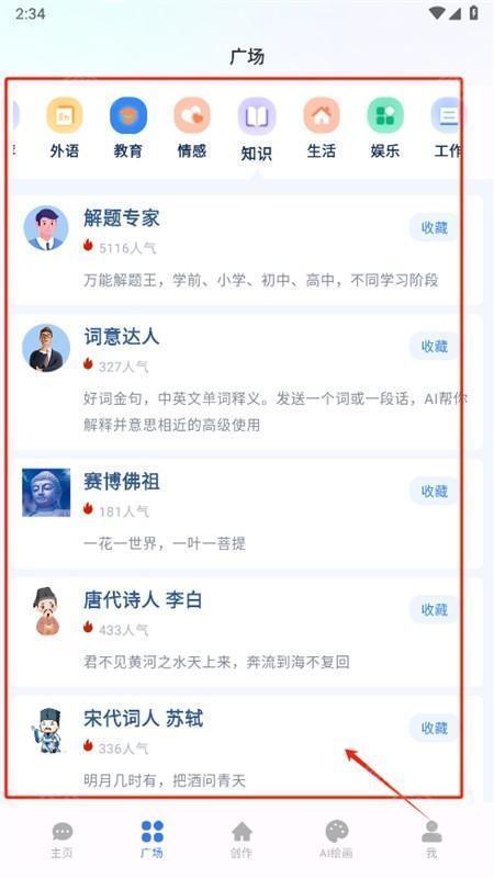 3、在广场页面可以选择自己感兴趣的AI机器人进行提问