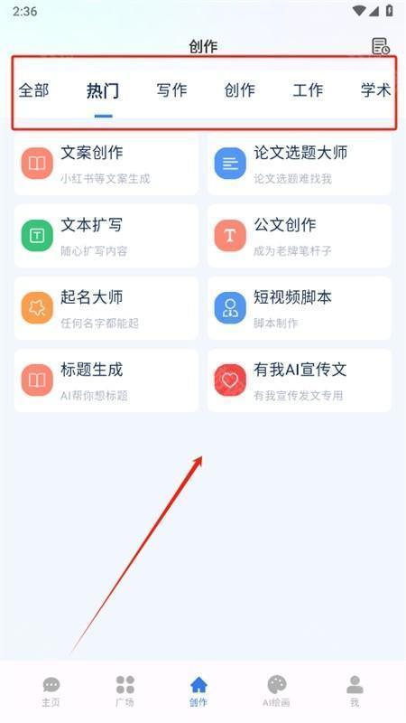 4、点击创作,这里为大家提供了写作、学术、工作、学习等超多创作功能