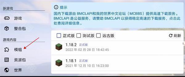 1、选择好一个新的游戏版本点击进入,找到模组功能。