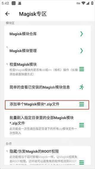 在【Magisk专区】中,您可以选择检查Magisk模块,或者对其进行管理,此外,您还可以通过添加单个Magisk模块*.zip文件来扩展系统功能。