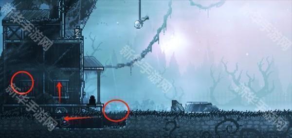 往左走到屋前松动的木板处,连续跳几次让木板断裂,钻入地道进入屋内并获得镰刀。随后打开房门,利用镰刀击杀门外的黑色怪物。
