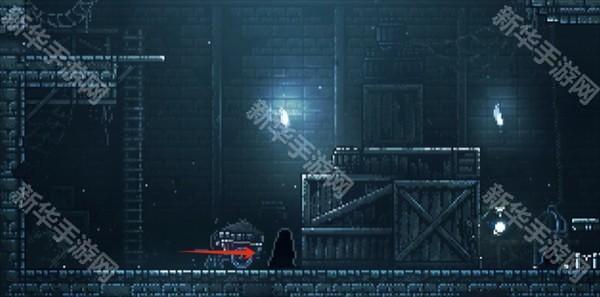 5、将推车推到梯子与黑色怪物之间,爬上梯子并跳跃吸引怪物。当怪物跳下后,推车压制怪物完成击杀。继续向右行进,进入笼子区域左侧。