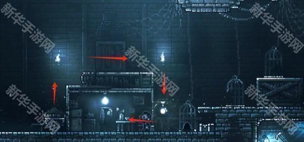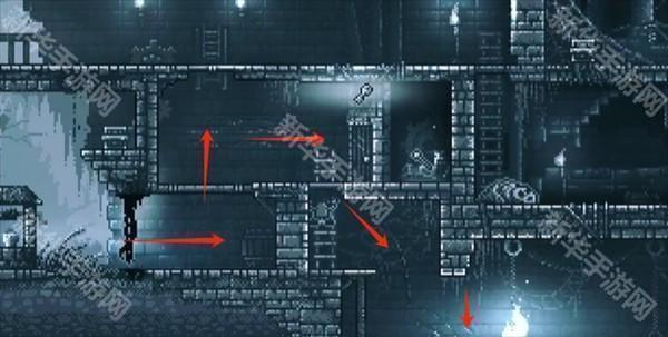 15、遭遇怪物后立即撤退,待怪物越过右侧障碍时,迅速爬上左边梯子并往左跑,一路上爬至顶层,再向右移动,最终将怪物引入尖刺陷阱中消灭。
