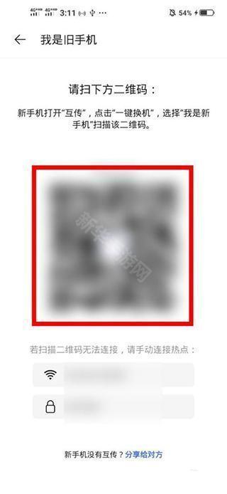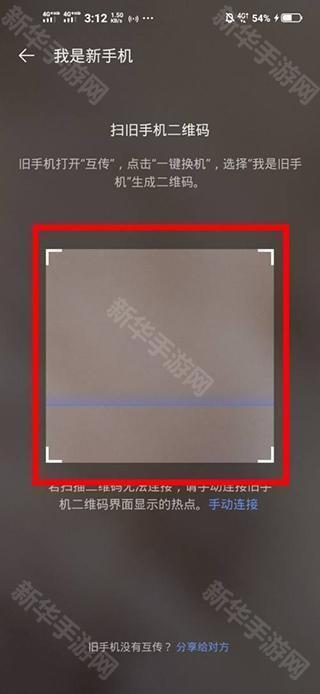 10、屏幕上会出现一个扫描框,将手机的摄像头对准上面旧手机屏幕上的二维码进行扫描,旧手机上面的数据就会一键转移到新手机。