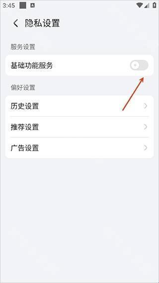 3、进入隐私设置页面,找到广告设置关闭即可。