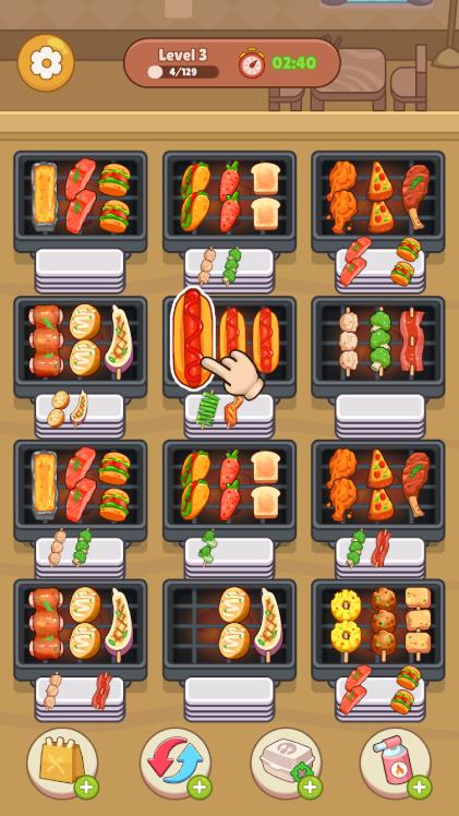 这款游戏让玩家能够轻松的挑战不一样的乐趣,通过将三个相同的烧烤放在同一个烤炉上,即可获得一个新的外卖,这样就可以给外卖员送出去了,喜欢的快来试试看吧。