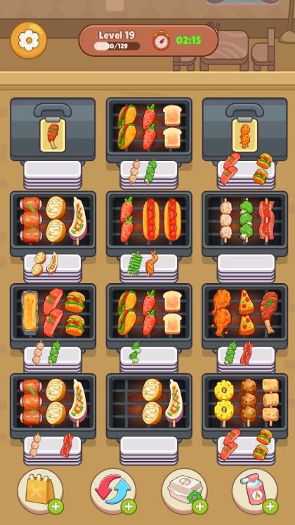 1、玩法很简单,就是移动不同的烤串到空位上,三个一样的烤串就可以成功消除上菜;