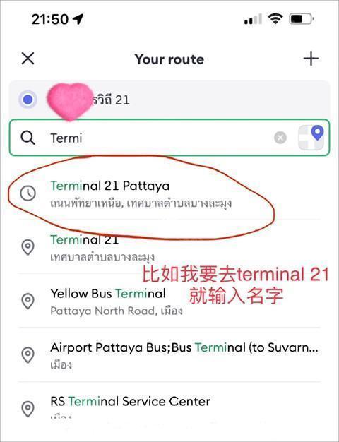 2、假如你要去Terminal 21,只需输入地点名称即可轻松选择。