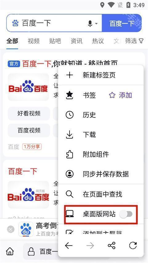 1、 首先我们进入火狐浏览器安卓版当中,然后在搜索处搜索自己的需求,这里以百度为例;
