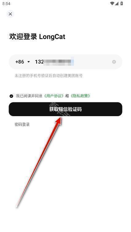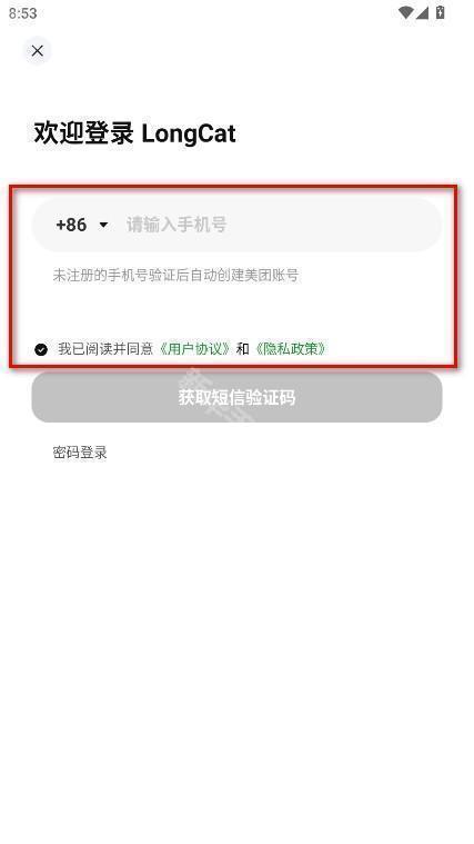 1、打开LongCat,输入手机号,勾选我已阅读并同意《用户协议》和《隐私政策》,这里需要注意的是未注册的手机号验证后自动创建美团账号。