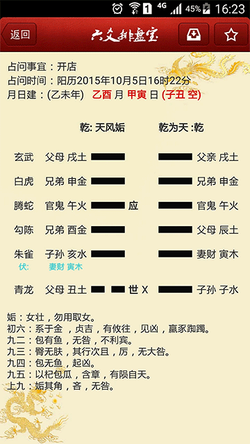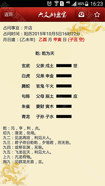排盘好了我们就可以看见我们卜卦后的结果了。