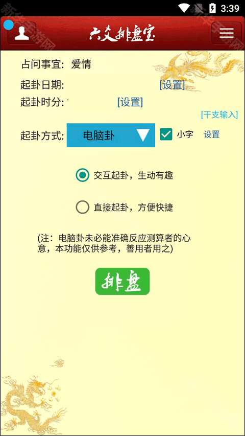 首先我们进入app的主页,在主页中填写自己的占问事宜、起卦日期以及起卦时分,之后我们就要选择起卦方式了,如果你是专业人士的话其他的起卦方式你应该懂,小编就用电脑卦来做示范吧。我现在我们选择交互起卦还是直接起卦。