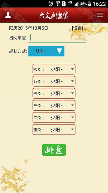 《六爻排盘免费版》这是一款非常好用的手机排盘软件,使用起来非常好用,喜欢的用户可以来下载六爻排盘免费版体验下,六爻排盘这个功能是传承了中国五千年的周易人文思想,既可以告诉用户命理变化的秘密,帮助他们了解命运,也有助于他们决断未来的事情,按照最讲究风水的角度去看待命运问题,而且这款六爻排盘软件还支持手动八卦、数字八卦、时间八卦等多种八卦方式,快来下载六爻排盘免费版吧!