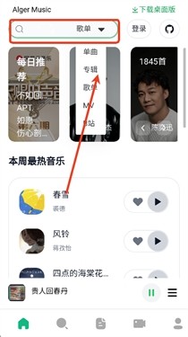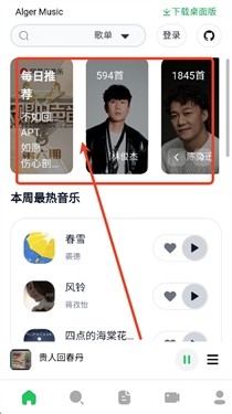 1、进入algermusic首页,可以查看榜单音乐内容,或者近期热门歌单等。