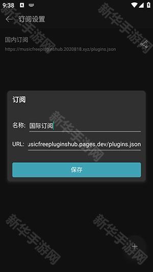 3、输入订阅源链接以及名称。国内:https://musicfreepluginshub.2020818.xyz/plugins.json国际:https://musicfreepluginshub.pages.dev/plugins.json