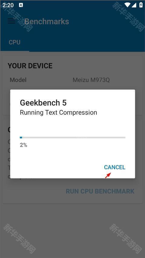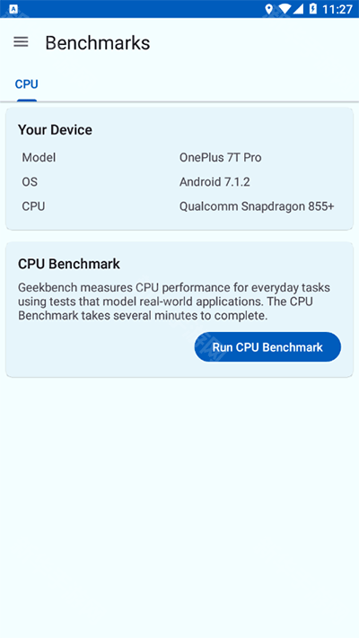 1、打开Geekbench进入首页后,就能看到品牌、CPU等信息,点击“RUN CPU BENCHMARK”按钮开始性能测试。