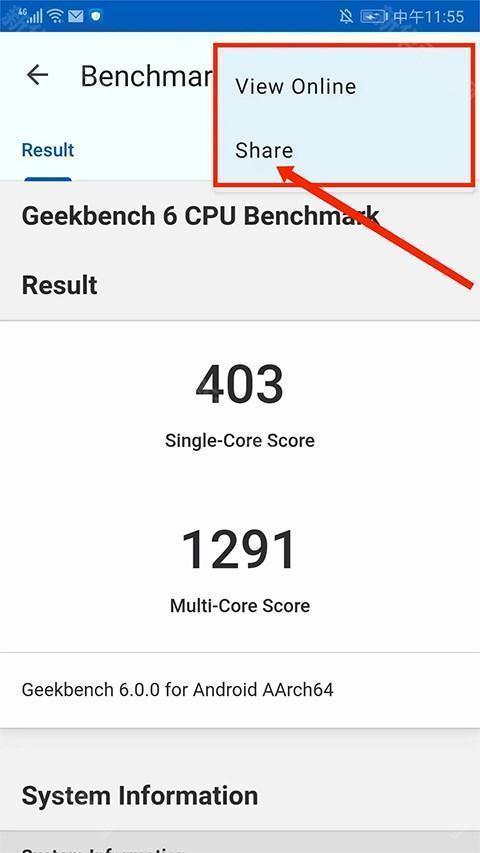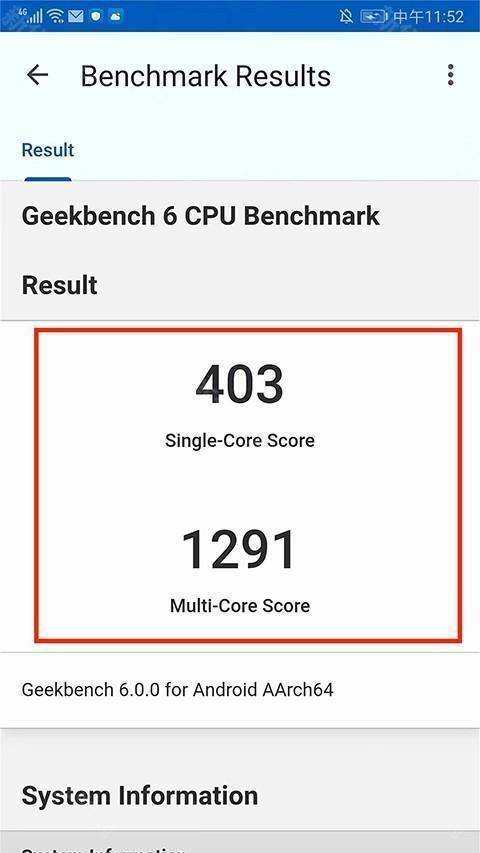 4、测试完成后,可看到当前手机的Single-Core Score单核分数和Multi-Core Score多核分数,往下滑动屏幕,还可以看到System Information系统信息、CPU InformationCPU信息等等关于手机的所有详细参数。