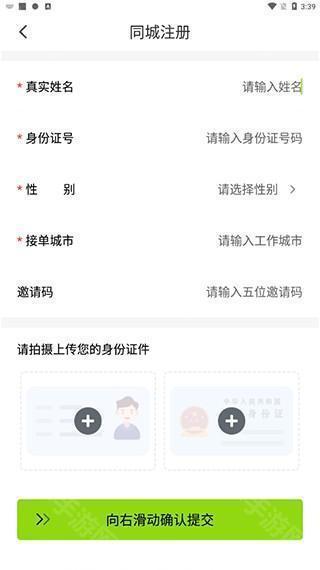 2、按要求填写姓名、证件号码、性别、接单城市,再拍摄上传身份证进行提交,审核通过即可进行接单。