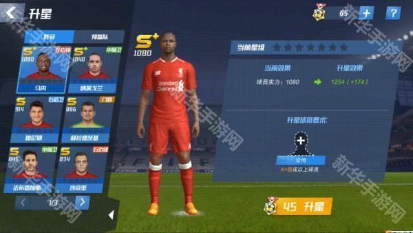 2、玩到11级左右(忘了11还是12了),升星功能开启,升星主要是吃球员+升星材料,球员要求倒不高,s+只要a+的就行了。吐槽下,升星功能开启竟然也没有引导,我还找了一段时间才找到哪里进去,必须吐槽。不过升星加成还是挺可观的,s+升一星瞬间加200的能力,开心!