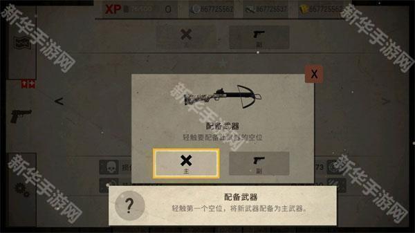 3、然后要配备新购买的武器,轻触“配备”按钮。轻触第一个空位,将新武器配备为主武器;