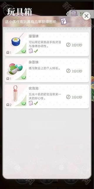 15、点击给玩具,选择玩具箱(不同玩具箱中的玩具能够产出的服装图纸也是不一样的)