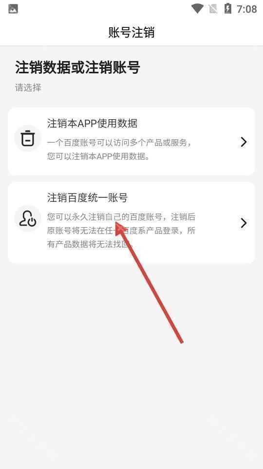 2、账号注销页面提供注销本APP使用数据和注销百度统一账号两个选项,点击后者则永久注销百度账号,注销后无法登录百度系产品,所有关联数据也无法找回。