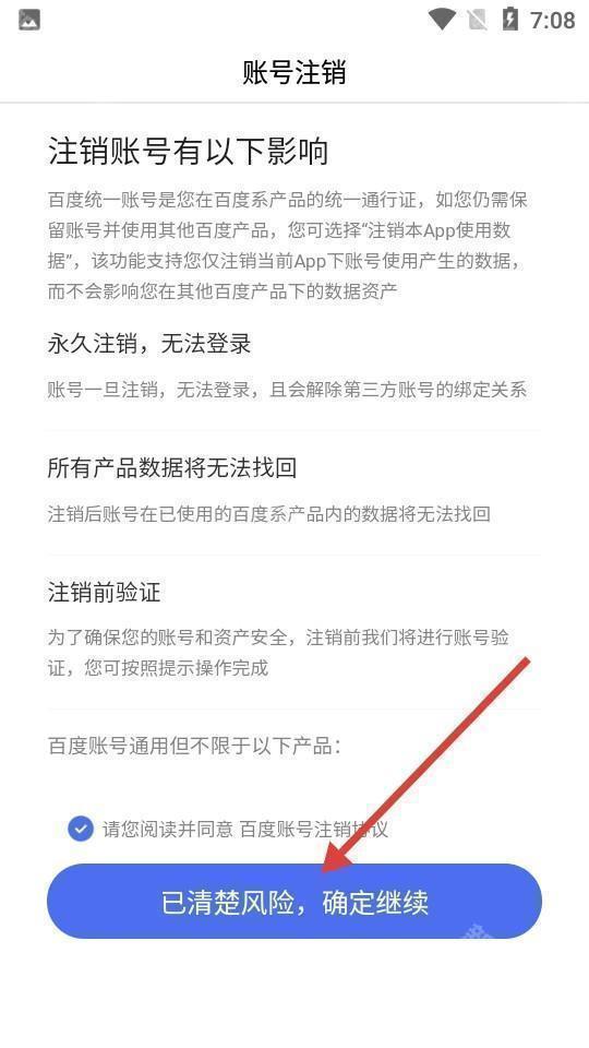 3、进入账号注销流程的说明页,用户阅读并勾选同意协议后,点击已清楚风险确定继续按钮,就能进入后续注销步骤,保障账号注销操作的知情权与安全性。