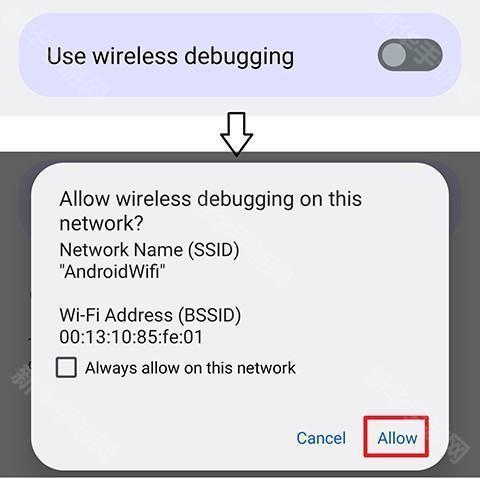 4、点击启用“无线调试”右侧按钮,然后点击Allow(允许)