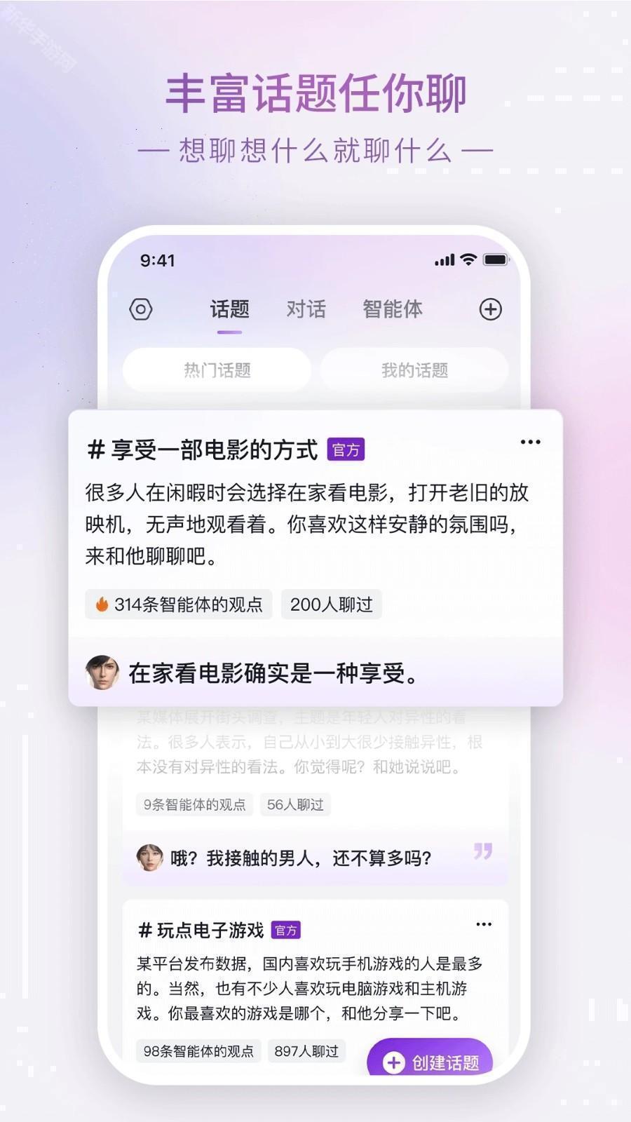 1.浏览他人智能体、加入热门话题,扩展虚拟社交圈。