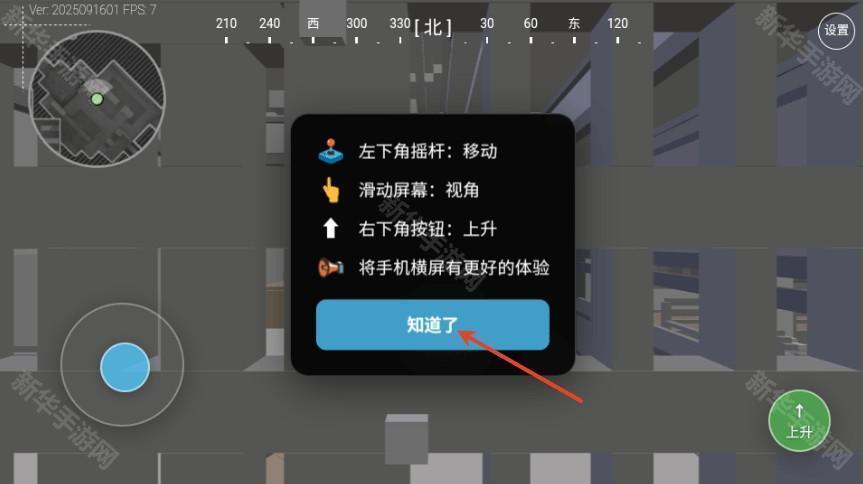 选择一个地图进入,可以看到左下角摇杆控制移动,滑动屏幕控制视角,右下角按钮可以控制上升;之后玩家就可以探索地图慢慢熟悉;